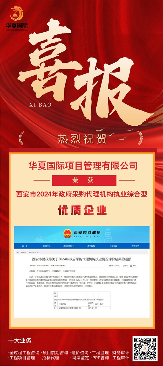 華夏國際項目管理有限公司獲評西安市2024年政府采購代理機構(gòu)執(zhí)業(yè)綜合型優(yōu)質(zhì)企業(yè)