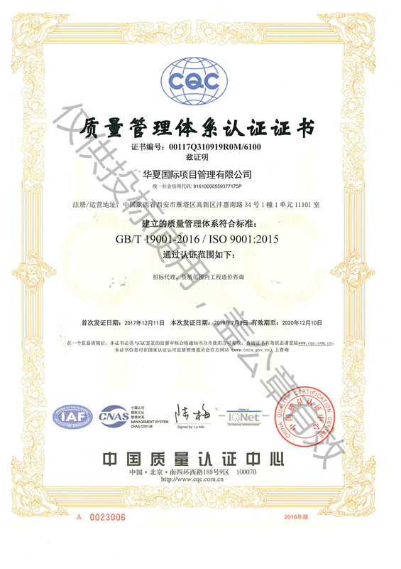 質(zhì)量管理體系認證證書