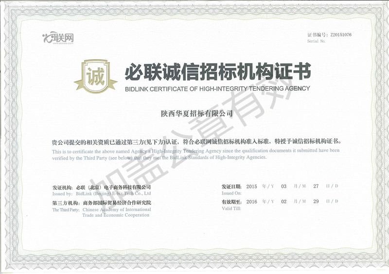 必聯(lián)誠信招標機構證書